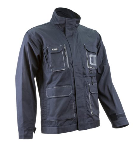 Twill: 60% pamut / 40% poliészter - 245 g/m2dzsekifazonú bikolor kabát tépőzárral állítható mandzsettávalállig érő húzózár, szennyeződésektől védő, tépőzáras cipzárfedővel, magas álló gallérbeépített névjegykártyatartóa betéttel azonos színű varrásokkét fedett rávarrt oldalzseb, két, cipzáras bebújós oldalzseb, egy fedett telefonzsebegy cipzáros, függőleges felső zseb, egy tolltartós felső zseb, egy rávarrt fedett felső zseb névjegykártyatartóvalegy vízszintes cipzáros zseb bal oldalon, egy tolltartós zseb a bal ujjonegy kitűzőtartó gyűrű