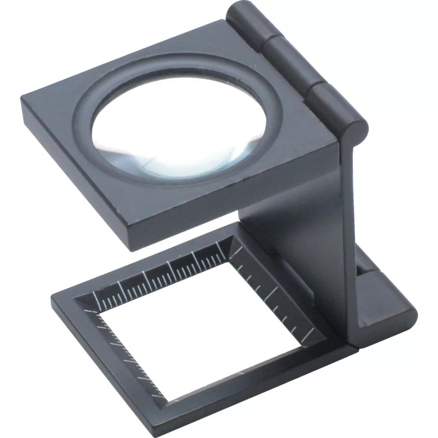 Zsebnagyító - 30mm. Eredetileg textilipari vizsgálatokra használták de alkalmazzák papír fotók nyomtatott dokumentumok stb ellen rzésére is 30mm átmér 30mm átmér jű üveg lencsék 6x nagyítás 38mm 11 2 hatótávolság 25mm 1 négyszögletes látómez Metrikus és inches fokbeosztás 1mm és 1 8 osztásköz Használat után laposra összehajtható Fekete porbevonatú alaptest Műanyag tárcában