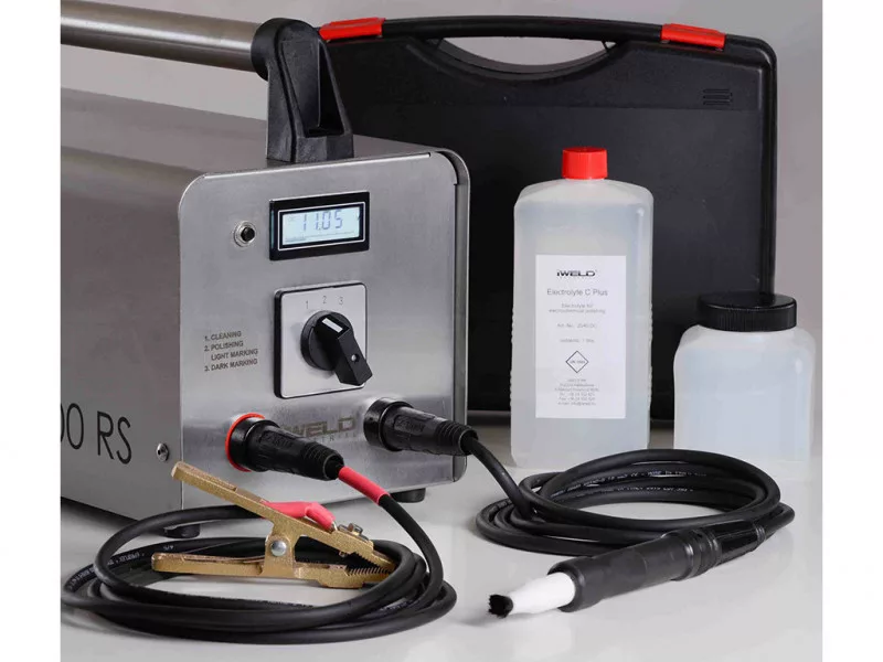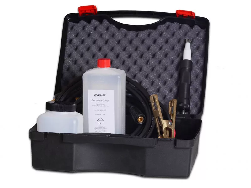 1x Műanyag koffer 1x Műanyag tégely fedéllel, 500 ml-es 1x Csatlakozó kábel piros, 3 m, bajonettzárral és testcsipesszel 1x Csatlakozó kábel fekete, 3 m, bajonettzárral 1x nagyteljesítményű szénecset 1x Elektrolit "C " polírozáshoz, 1 liter