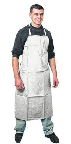 * fehér színű, poliészter/pamut alapra kétszer mártott PVC* 0,30 mm vastag, mérete: 110 x 75 cm * rögzítés szalagokkal derék- és nyakrészen* véd fröccsenő folyadékok és vegyszerek ellen