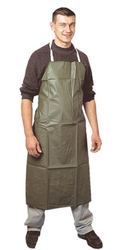 * zöld színű, poliészter/pamut alapra kétszer mártott PVC* 0,30 mm vastag, mérete: 110 x 75 cm * rögzítés szalagokkal derék- és nyakrészen* véd fröccsenő folyadékok és vegyszerek ellen