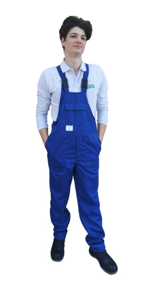 * királykék 245 g/m2 kopásálló, sávoly kötésű, 65% poliészter, 35% pamut alapanyag* folyadéklepergető védőruházat, korlátozott védelmet nyújt kisnyomású vagy fröccsenő, folyékony vegyszerek ellen (pl. kénsav, lúg, o-Xilol és butanol) – 6. típusú és PB (6) típusú védőeszköz* biztonsági kettős lánc-, plusz háromfonalas szegőöltés* állítható, gumibetétes vállpánt, magasított oldal, gumírozott hátrész, két függőleges nyílású biztonsági foltzseb és a mellrészen egy tépőzáras zsebfedővel rendelkező biztonsági zseb
