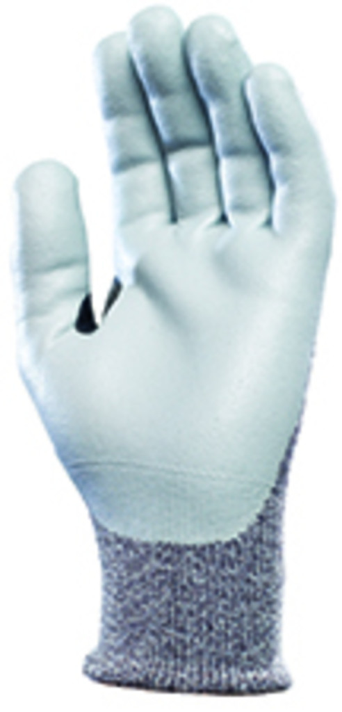 * nagy szakítás- és kopásállóságú, 10-es kötésű alapkesztyű, vágásbiztos HPPE, kompozit szintetikus szálakból* tenyéren szürke, kétkomponensű, hajlékony, olajálló nitril/poliuretán bipolimer mártás* rugalmas mandzsetta, szellőző kézhát