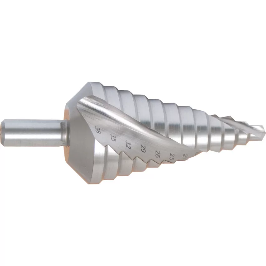 Lépcs's lemezfúró, HSS. Jó min ségű furatok el állítására képes anyagok széles választékánál asztali fúrógépen vagy kisebb oszlopos fúrógépeken használva Mindegyik szerszám egytengelyű furatokat állít el adott mérettartományon belül Max 1 8 3 mm vastag anyagokhoz