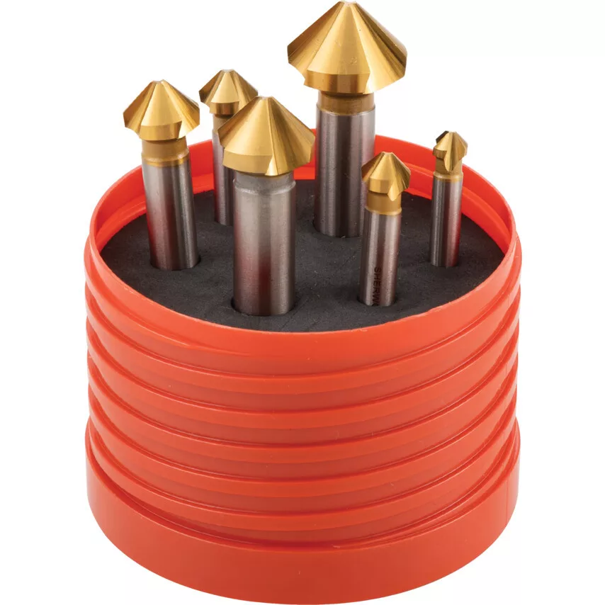 TiN borítású gyorsacél (5% Co) süllyeszt' készlet - 90°. 6 darabos készlet - Több hornyú nagy teljesítményű HSS-E gyorsacélból készült sorjázásra és leélezésre Egyenes szár élezett horony 90 -os szög Méretek 6 8 10 12 5 16 és 20mm Gyártási szabvány BS328 5 rész 1983 Süllyesztési szög 90