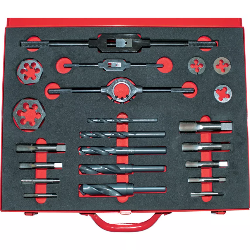BSPF (brit csőillesztési szabvány) gyorsacél menetfúró készlet – 22 darabos. 22 darabos BSPF brit csőillesztési szabvány gyorsacél menetfúró készlet célirányos tervezésű dobozban Tartalom Gyorsacél menetfúrók - ISO 529 Gyorsacél köszörült menetű egyenes hornyú anyamenetfúró 1 8 x 28 BSPF x 19 BSPF 3 8 x 19 BSPF x 14 BSPF Gyorsacél köszörült menetű egyenes hornyú készrevágó menetfúró 1 8 x 28 BSPF x 19 BSPF 3 8 x 19 BSPF x 14 BSPF Gyorsacél köszörült menetű egyenes hornyú utánvágó menetfúró x 14 BSPF Gyorsacél menetmenetmetszők BS 1127 1 5 16 külső átmérőjű gyorsacél menetmetsző 1 8 x 28 BSPF x 19 BSPF 3 8 x 19 BSPF Gyorsacél menetmetsző anyák BS 1127 Hatszögletű gyorsacél menetmetsző anya x 14 BSPF x 14 BSPF Gyorsacél fúrók BS328 DIN 338N Gyorsacél egyenes szárú spirálfúró 8 8 mm 11 8 mm Gyorsacél csökkentett szárú fúró 15 25 mm 19 mm 24 5 mm Foglalatok 1 5 16 külső átmérőjű menetmetsző hajtóvas Hagyományos hajtóvas 1 16 - -