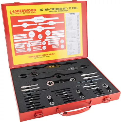 Menetszerszám készlet. Menetszerszám készlet M2-M16 37 darabos HSS köszörült el vágó és készrevágó menetfúrók M2 x 0 40 M3 x 0 50 M4 x 0 70 M5 x 0 80 M6 x 1 00 M8 x 1 25 M10 x 1 50 és M12 x 1 75 Az ISO 529 szabvány el írásai szerint gyártva Egyenes szárú menetfúró hajtóvasak 1 16 - 1 4 és 3 16 - 1 2 Magfúrók 1 6 2 5 3 3 4 2 5 0 6 8 8 5 és 10 2 mm 13 16 küls átmér jű kör alakú hasított menetmetsz k M2 x 0 40 M3 x 0 50 M4 x 0 70 M5 x 0 80 és M6 x 1 00 1 küls átmér jű kör alakú hasított menetmetsz k M8 x 1 25 és M10 x 1 50 A BS 1127 szabvány el írásai szerint gyártva Menetmetsz hajtóvasak 13 16 és 1 küls átmér höz Hatszög alakú HSS menetmetsz k M12 x 1 75 és M16 x 2 00 A BS 1127 szabvány el írásai szerint gyártva