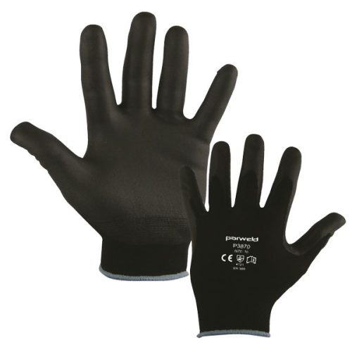 Szerelőkesztyű tenyér részen mártott P.U. fekete, rugalmas szövet kézháttal, 10-es