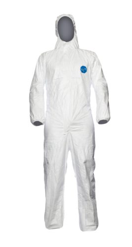 * Tyvek(R) 500 Xpert 1431N polietilén alapanyagú (41 g/m2), fehér, antisztatikus, kiemelten szellőző kapucnis védőoverall* véd 1 mikronnál (μ) nagyobb szemcsenagyságú porok, és radioaktív részecskék ellen* ellenáll 0,12 bar nyomásig vízbázisú, fröccsenő szervetlen vegyszereknek, illetve kórokozóknak, 5. és 6 típusú* teljesen szálmentes, gumirozott derék-, arc-, csukló- és bokarész, fedett cipzár