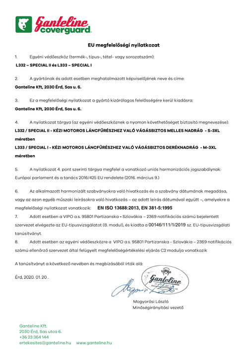 * kopásálló poliészter és szellőző pamut alapanyagok keveréke * az elejerészeken, a vállaknál és az ujjakon kilenc rétegű, aramidszálas vágásvédő betét * véd 20 m/s láncsebességű láncfűrész által okozott vágó hatás ellen* zöld színben, narancs rátéttel, két zsebbel, övbújtatókkal