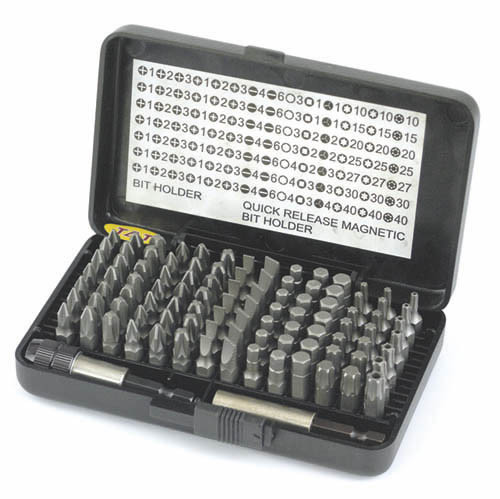 100 db-os készlet: 7 x Ph1, 7 x Ph2, 7 x Ph3, 7 x Pz1, 7 x Pz2, 7 x Pz3, 2 x T 10, 2 x T 15, 2 x T 20, 2 x T 25, 2 x T 27, 2 x T 30, 2 x T 40, TX10, TX15, TX20, TX25, TX27, TX30, TX40, 7 x H4, 7 x H6, 7 x Es 4, 7 x Es 6, mágneses bittartó és gyorscserélős mágneses tartó