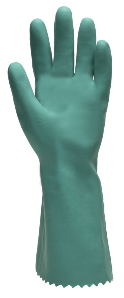 EUROCHEM NI550 zöld nitril vegyszerálló védőkesztyűKevertszálas pamut/poliészter belsővelSima felület, csipkézet mandzsettaVastagsága kb. 0,85 mm,a teljes hossza 350 mm"