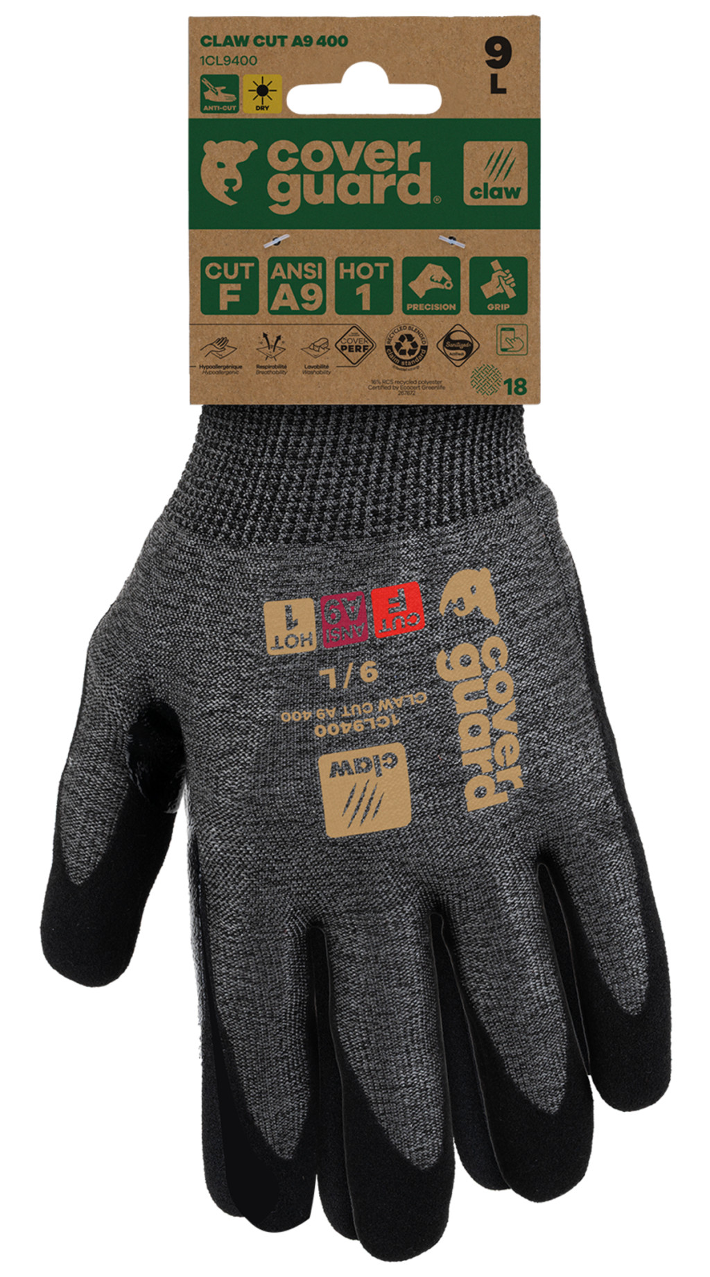 A CLAW CUT termékcsalád egy új generációs vágásálló kesztyű, amelyet azért hoztak létre, hogy megvédjen a legigényesebb munkák során, magas teljesítményszintek (CUT D-től A9-ig) vágásállósággal, és kiváló komfortot, valamint kivételes ügyességet biztosítson minden munkakörnyezetben (száraz, nedves és olajos).A CLAW CUT A9 400 valódi forradalom a vágások elleni védelem terén, a világ legmagasabb vágásállósági szintjével (CUT A9, az AINSI szabvány szerint). Ez a kesztyű finom anyagmozgatási munkákhoz készült száraz és enyhén olajos környezetben. A magas 18-as kötés, párosítva egy rendkívül puha és erős üvegszál, poliészter, acél és spandex alapú szálból készült anyaggal, kivételes komfortot nyújt, miközben rendkívüli teljesítményt biztosít.A sandy nitril bevonat és a hosszú megerősítés a hüvelykujj és a mutatóujj között kiváló tapadást és jó fogást biztosít. Ez a bevonat nagyon jó légáteresztőséget garantál (COVERPERF címke alatt tesztelve).A CLAW CUT A9 400 újrahasznosított poliészterből készült, és RCS tanúsítvánnyal rendelkezik (a termék teljes súlyának 16%-a). Üvegszál nélkül.Ez a kesztyű érintőképernyő kompatibilis, így viselése közben is használhatja a képernyős eszközöket. Sanitized kezelés: megakadályozza a baktériumok és szagok fejlődését,