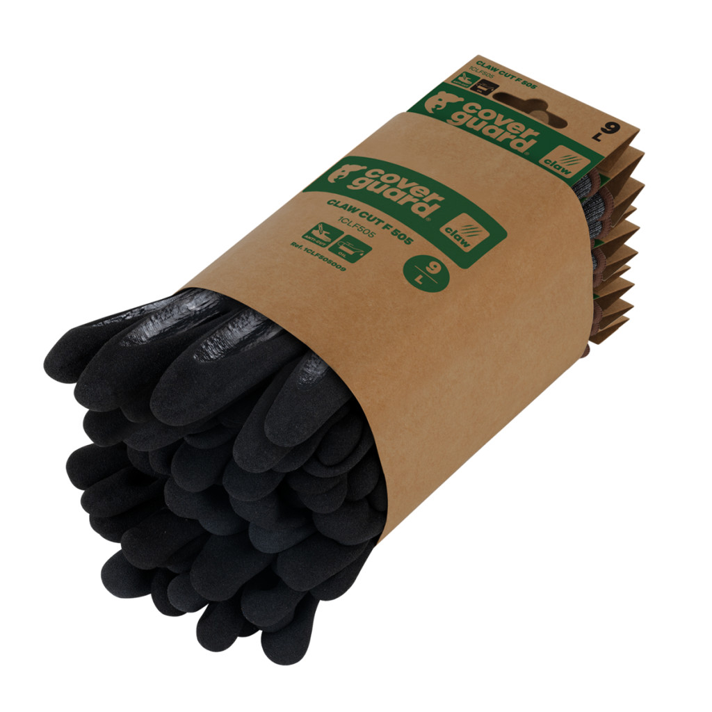 A CLAW CUT termékcsalád egy új generációs vágásálló kesztyű, amelyet a legigényesebb munkákhoz terveztek, magas vágásállósággal (CUT D-től A9-ig), és kiváló kényelmet, valamint kivételes ügyességet biztosít minden munkakörnyezetben (száraz, nedves és olajos).A CLAW CUT F 505 modellt finom anyagmozgatási munkákhoz tervezték száraz és olajos környezetben. A magas 18-as kötés, amely egy rendkívül puha és erős üvegszál, poliészter, acél és spandex alapú anyagból készült, kivételes kényelmet biztosít, miközben maximális vágásvédelmet nyújt (CUT F, az EN388 szabvány szerint).A nitril dupla rétegű bevonat (3/4 sima + tenyér szemcsézett / homokszerű felület) vízálló, és a hosszú megerősítés a hüvelykujj és a mutatóujj között kiváló tapadást és jó fogást biztosít a legigényesebb száraz és olajos munkák során, valamint magas védelmet nyújt a kopás ellen (COVERPERF címke: >20.000 ciklus).A CLAW CUT F 505 újrahasznosított poliészterből készült, és RCS tanúsítvánnyal rendelkezik (a termék teljes súlyának 16%-a). Üvegszál nélkül.Ez a kesztyű érintőképernyő-kompatibilis, lehetővé téve, hogy viselése közben is használja a képernyős berendezéseket.Sanitized kezelés: megakadályozza a baktériumok és szagok fejlődését, és a CLAW CUT F 505 hypoallergén is (COVERPER
