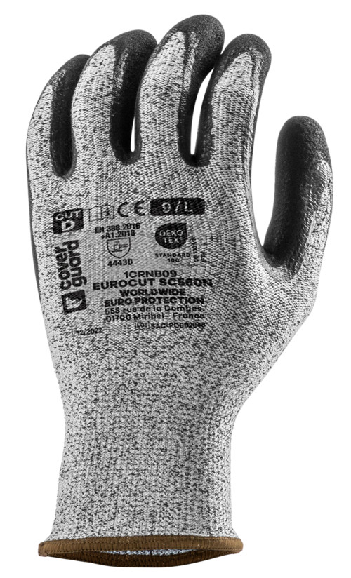 Szürke, pettyezett, HPPE-vel, sáványi szálakkal, poliamiddal és elasztánnal erősített varrás nélküli kesztyű.Fekete duplán mártott tenyér, egy sima rétegű és egy érdesített.Kötött mandzsetta.OEKO-TEX® STANDART 100, CQ 1301/1, IFTH minősített