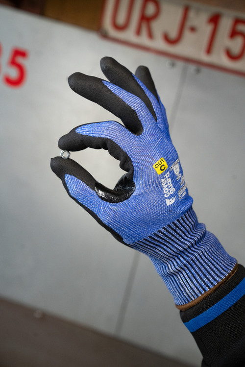 Kék, HDPE-vel, poliészterrel és elasztánnal erősített 13 kötésű kesztyű.Fekete nitril habosított tenyérrel.A hüvelyk- és mutatóujj között nitrillel erősített hajlat.Kötött mandzsetta.