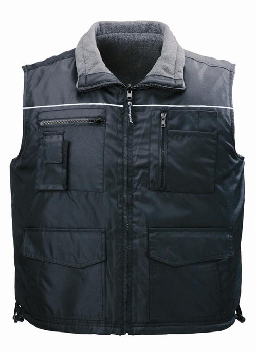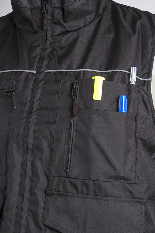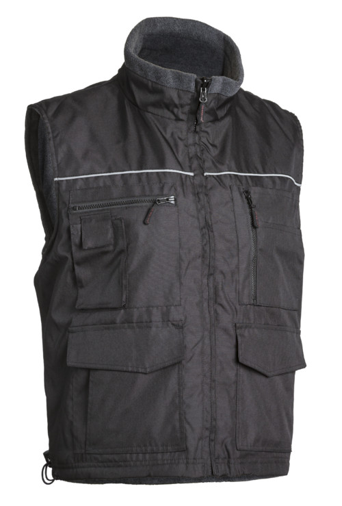 * PU-val impregnált 300D Oxford poliészter illetve polár* 280 g/m2 polárbélés és gallér* négy bebújós, egy telefon-, két zsebfedős-, valamint két külső- és két belső cipzáras zseb* derekat védő hosszított hátrész