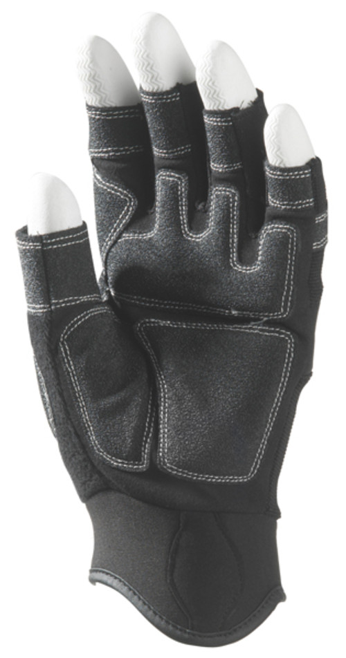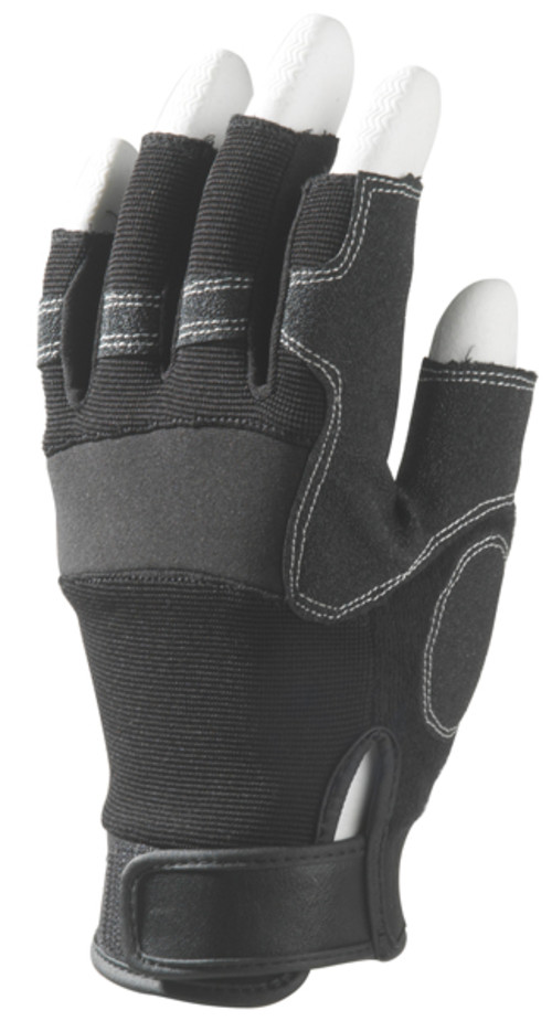 Ujjatlan kesztyű poliamid/PU tenyérrésszel és elasztán hátrésszel. Megerősített tenyér, PVC marok, neoprén bütyök és csuklórész. Tépőzáras mandzsettával