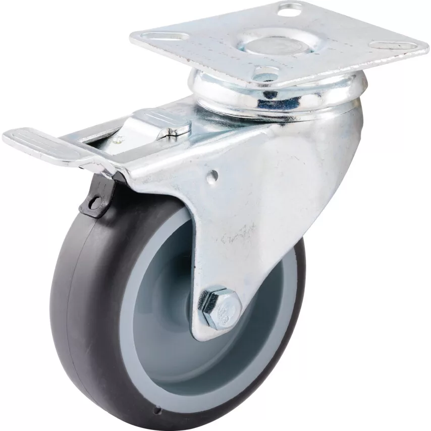 Kisteljesítményű préseltacél görgők - nyomot nem hagyó gumiabroncsos kerékkel és nejlonaggyal - siklócsapágy. Préseltacél görgők általános kisteljesítményű ipari vagy szervezeti felhasználásra Kapható felső lemezes vagy csavaros rögzítéssel és választható fékkel A görgőn szürke nyomot nem hagyó abroncs található ami enyhén tompítja a mozgásból adódó ütődéseket és védi a padlót