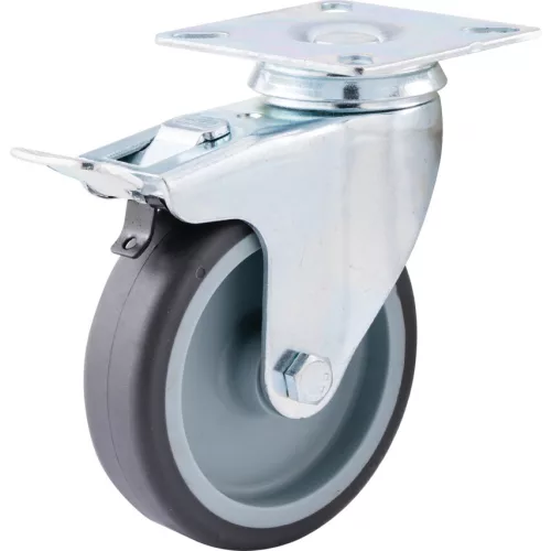 Kisteljesítményű préseltacél görgők - nyomot nem hagyó gumiabroncsos kerékkel és nejlonaggyal - siklócsapágy. Préseltacél görgők általános kisteljesítményű ipari vagy szervezeti felhasználásra Kapható felső lemezes vagy csavaros rögzítéssel és választható fékkel A görgőn szürke nyomot nem hagyó abroncs található ami enyhén tompítja a mozgásból adódó ütődéseket és védi a padlót
