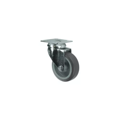 Kisteljesítményű préseltacél görgők - nyomot nem hagyó gumiabroncsos kerékkel és nejlonaggyal - siklócsapágy. Préseltacél görgők általános kisteljesítményű ipari vagy szervezeti felhasználásra Kapható felső lemezes vagy csavaros rögzítéssel és választható fékkel A görgőn szürke nyomot nem hagyó abroncs található ami enyhén tompítja a mozgásból adódó ütődéseket és védi a padlót
