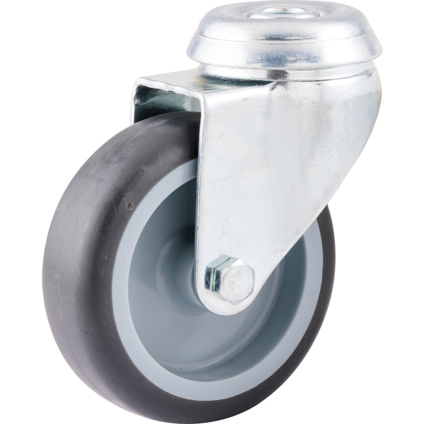 Kisteljesítményű préseltacél görgők - nyomot nem hagyó gumiabroncsos kerékkel és nejlonaggyal - siklócsapágy. Préseltacél görgők általános kisteljesítményű ipari vagy szervezeti felhasználásra Kapható felső lemezes vagy csavaros rögzítéssel és választható fékkel A görgőn szürke nyomot nem hagyó abroncs található ami enyhén tompítja a mozgásból adódó ütődéseket és védi a padlót