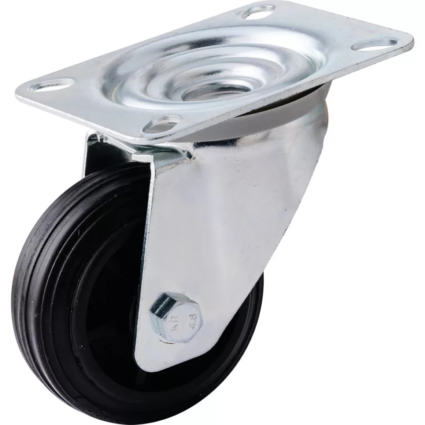 Közepes teljesítményű préseltacél görgők - gumiabroncsos kerékkel és polipropilén aggyal - golyóscsapágy. Préseltacél görgők általános közepes igénybevételű ipari felhasználásra Nejlonaggyal szerelt fekete ipari gumiabroncsos görgők tűcsapágyas kerekekkel