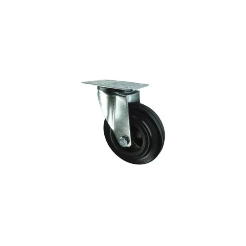 Közepes teljesítményű préseltacél görgők - gumiabroncsos kerékkel és polipropilén aggyal - golyóscsapágy. Préseltacél görgők általános közepes igénybevételű ipari felhasználásra Nejlonaggyal szerelt fekete ipari gumiabroncsos görgők tűcsapágyas kerekekkel