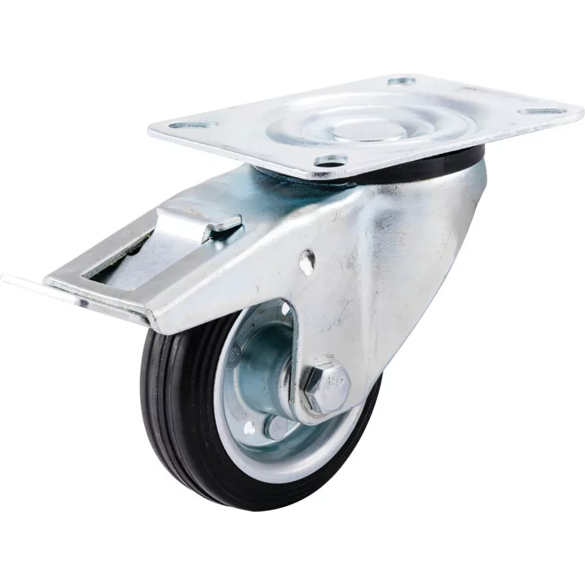 Közepes teljesítményű préseltacél görgők - gumiabroncsos kerékkel és préseltacél aggyal - golyóscsapágy. Préseltacél görgők általános közepes igénybevételű ipari felhasználásra Acélaggyal szerelt fekete ipari gumiabroncsos görgők tűcsapágyas kerekekkel