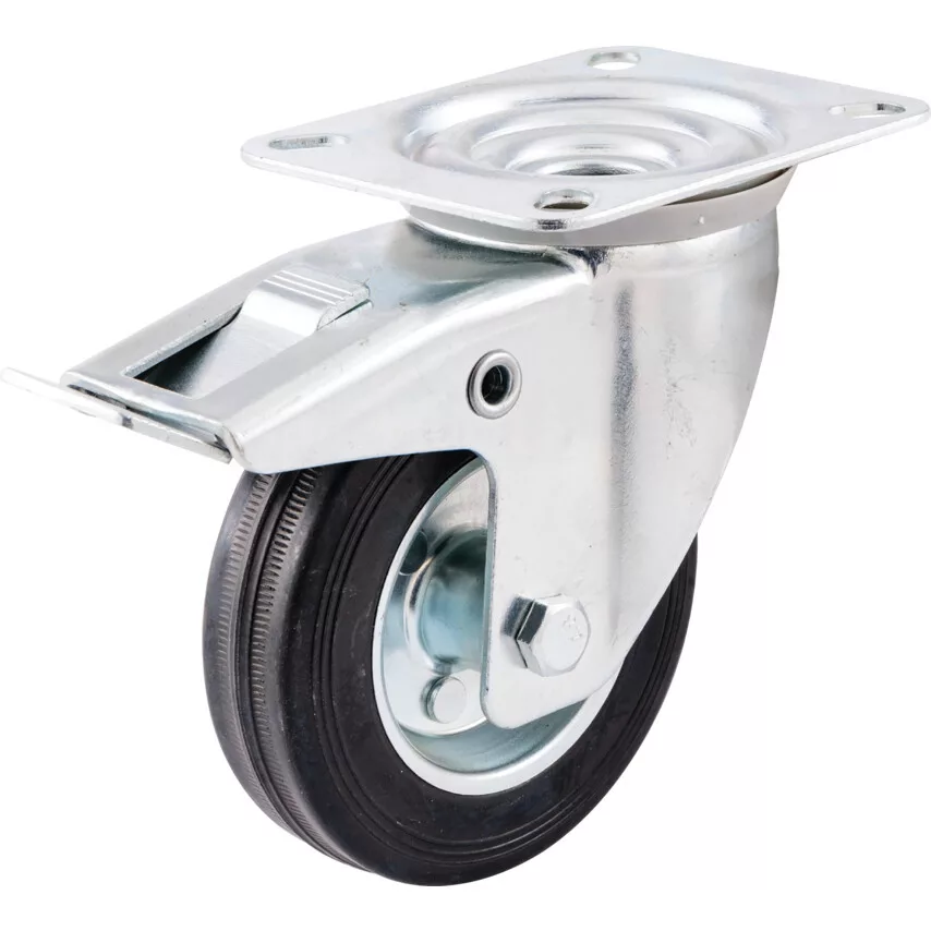 Közepes teljesítményű préseltacél görgők - gumiabroncsos kerékkel és préseltacél aggyal - golyóscsapágy. Préseltacél görgők általános közepes igénybevételű ipari felhasználásra Acélaggyal szerelt fekete ipari gumiabroncsos görgők tűcsapágyas kerekekkel