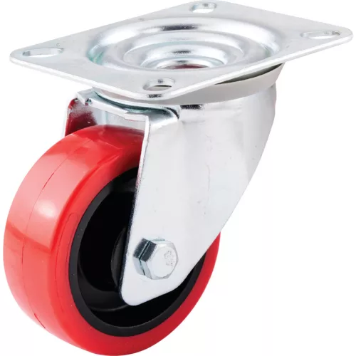 Közepes teljesítményű préseltacél görgők - poliuretán abronccsal szerelt kerék nejlonaggyal - görgőscsapágy. Préseltacél görgők általános közepes igénybevételű ipari felhasználásra Kapható felső lemezes vagy csavaros rögzítéssel és választható fékkel A tartós poliuretán abronccsal szerelt görgők nem hagynak nyomot és védik a padlót