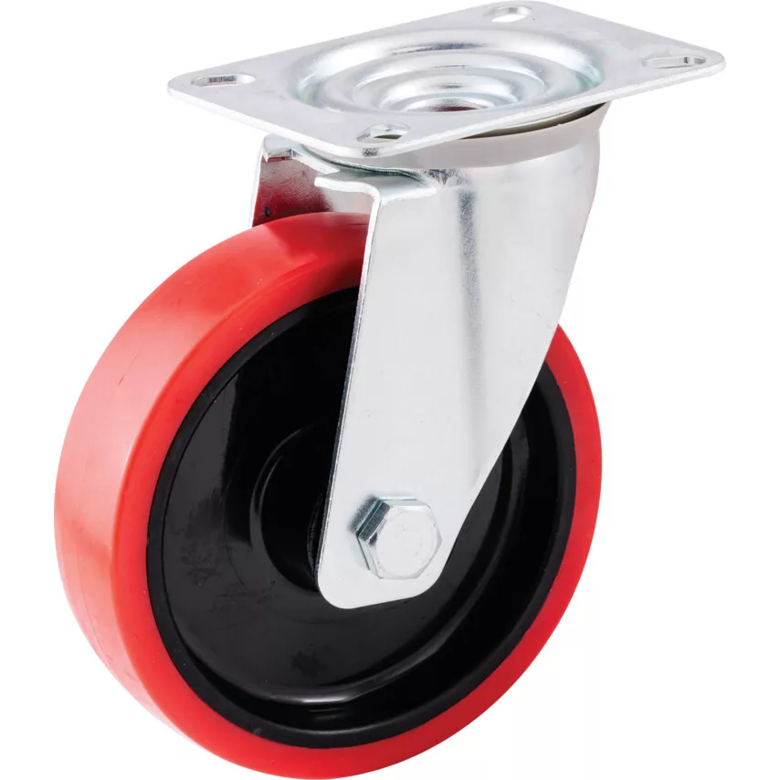 Közepes teljesítményű préseltacél görgők - poliuretán abronccsal szerelt kerék nejlonaggyal - görgőscsapágy. Préseltacél görgők általános közepes igénybevételű ipari felhasználásra Kapható felső lemezes vagy csavaros rögzítéssel és választható fékkel A tartós poliuretán abronccsal szerelt görgők nem hagynak nyomot és védik a padlót