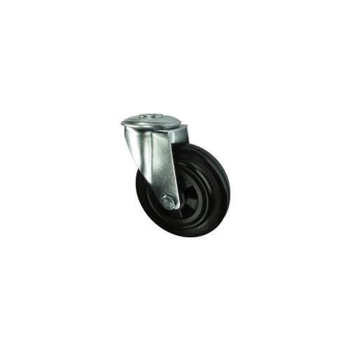 Közepes teljesítményű préseltacél görgők - gumiabroncsos kerékkel és polipropilén aggyal - golyóscsapágy. Préseltacél görgők általános közepes igénybevételű ipari felhasználásra Nejlonaggyal szerelt fekete ipari gumiabroncsos görgők tűcsapágyas kerekekkel